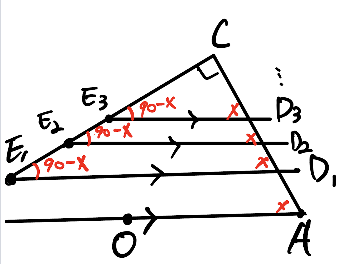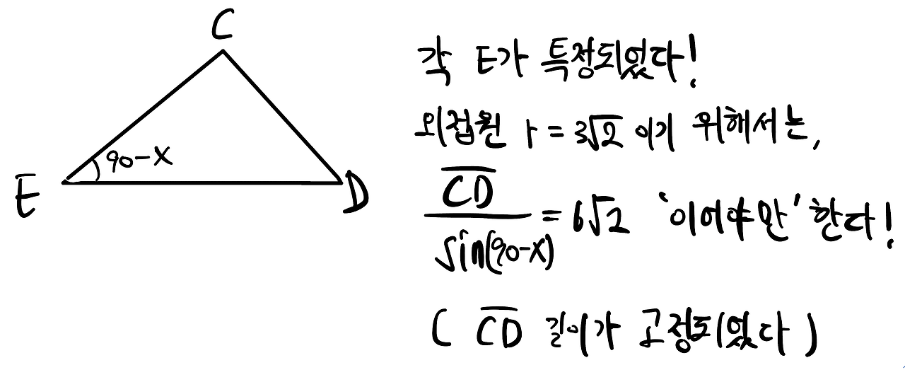 여기서 가능한 모든 E의 후보들중, 각CED=90-X 로 모두 같다는 것을 알 수 있습니다.