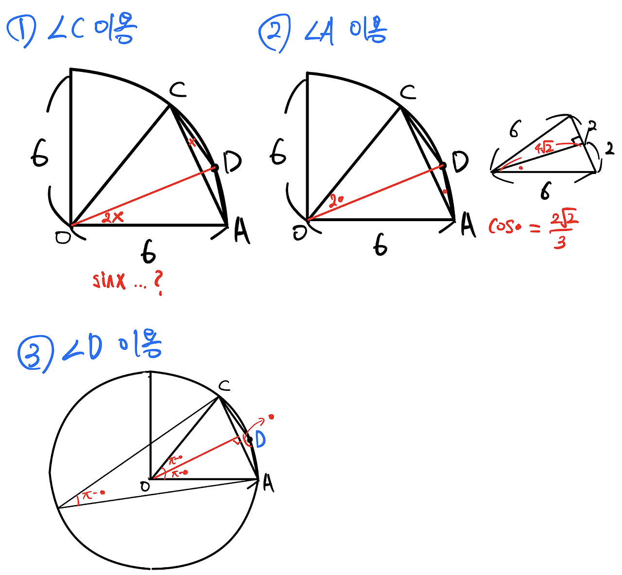3-1) 각 C를 활용하여 사인법칙을 이용하겠단 일념입니다. 그런데 원주각, 중심각을 아무리 활용해도 각 C를 구할 길이 없어보입니다. 생각해보니 각 C를 애초에 구할 수 있었으면 여태껏 한게 모두 뻘짓이 됩니다.