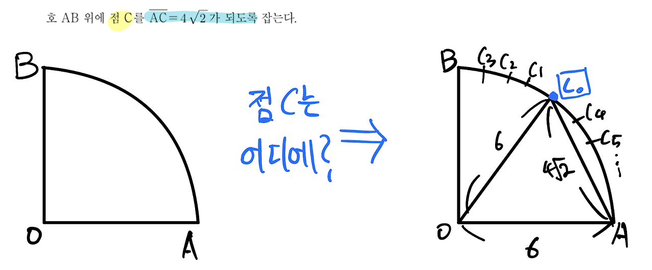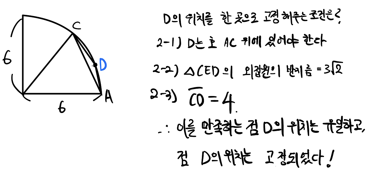 D는 호 AC 위에 존재한다네요. 호 AC위의 수많은 점들중, 점 D의 위치를 한곳으로 고정시키는 조건은 무엇일까요?