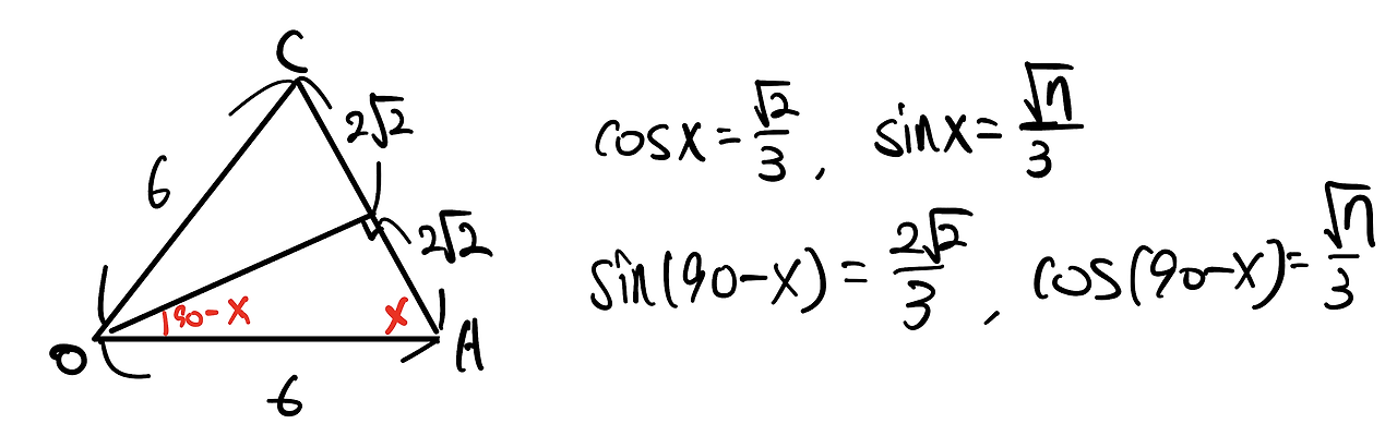구할 수 있는 각이 있을까요? OA,OC,AC의 길이를 다 알기 때문에, 각X를 구할 수 있습니다. 심지어 이쁜 이등변삼각형이군요.