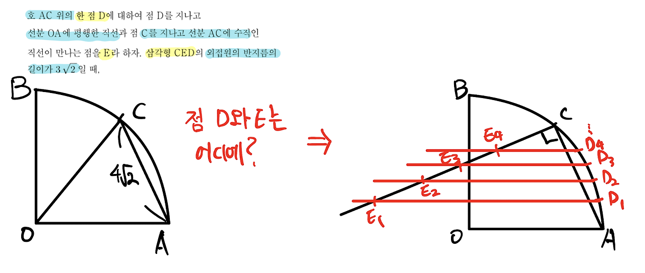 DE는 OA와 평행이라고 하네요. E가 될 수 있는 점들 중, 굳이 ‘평행’ 정보를 준 이유가 무엇일까요?