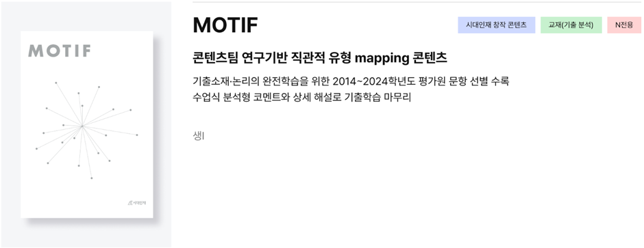 MOTIF는 콘텐츠팀 연구기반 직관적 유형 mapping 콘텐츠로, 기출소재•논리의 완전학습을 위한 2014~2024학년도 평가원 문항 선별 수록하여 수업식 분석형 코멘트와 상세 해설로 기출 학습 마무리가 가능합니다.