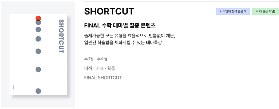 SHORTCUT은 FINAL 수학 테마별 집중 콘텐츠로, 출제가능한 모든 유형을 효율적으로 빈틈없이 채운, 일관된 학습법을 체회시킬 수 있는 테마 특강입니다.