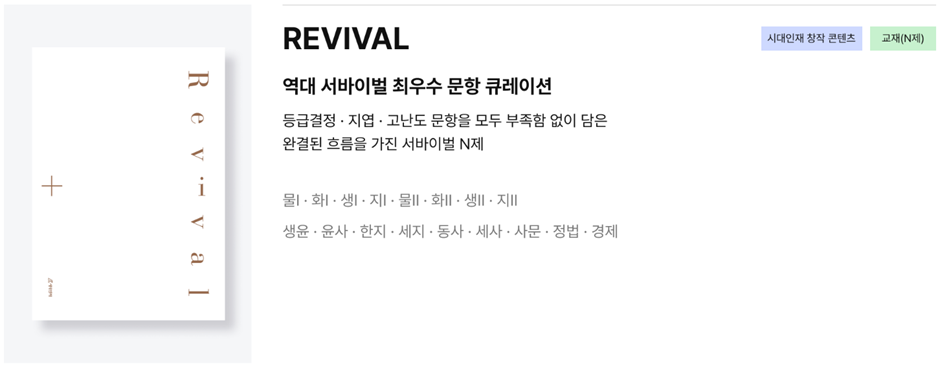 REVIVAL은 역대 서바이벌 최우수 문항 큐레이션으로, 등급결정•지엽•고난도 문항을 모두 부족함 없이 담은 완결된 흐름을 가진 서바이벌N제입니다.