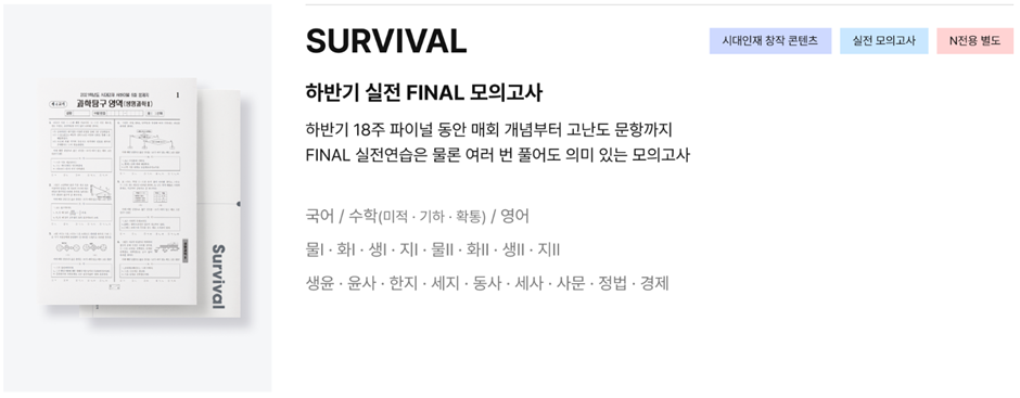 SURVIVAL은 하반기 실전 FINAL 모의고사로, 하반기 18주 파이널 동안 매회 개념부터 고난도 문항까지 FINAL 실전연습은 물론 여러 번 풀어도 의미 있는 모의고사입니다.