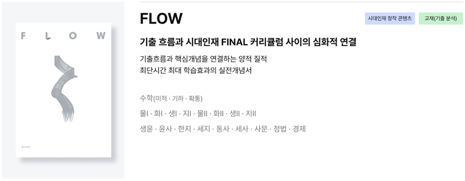 FLOW는 기출 흐름과 시대인재 FINAL 커리큘럼 사이의 심화적 연결로, 기출흐름과 핵심개념을 연결하는 양적, 질적 최단시간 최대 학습효과의 실전개념서입니다.